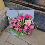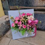 Aranjamentul conține: 1 x Trandafiri, 2 x Trandafiri Tros, 3 x Cymbidium, 1 x Hypericum, 1 x Chamelaucium, 2 x Feriga, 1 x Burete, 1 x Panglica, 1 x Tablou lemn