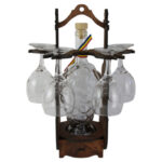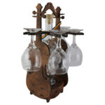Suport lemn in forma de vioara cu o sticla si 4 pahare
