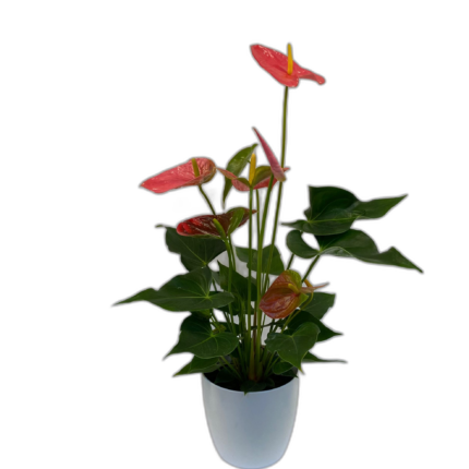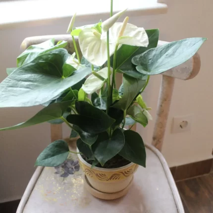 Este o plantă decorativă, cu frunze mari în formă de săgeată, una dintre frunze, răsucită în formă de cornet, înconjurând inflorescența.